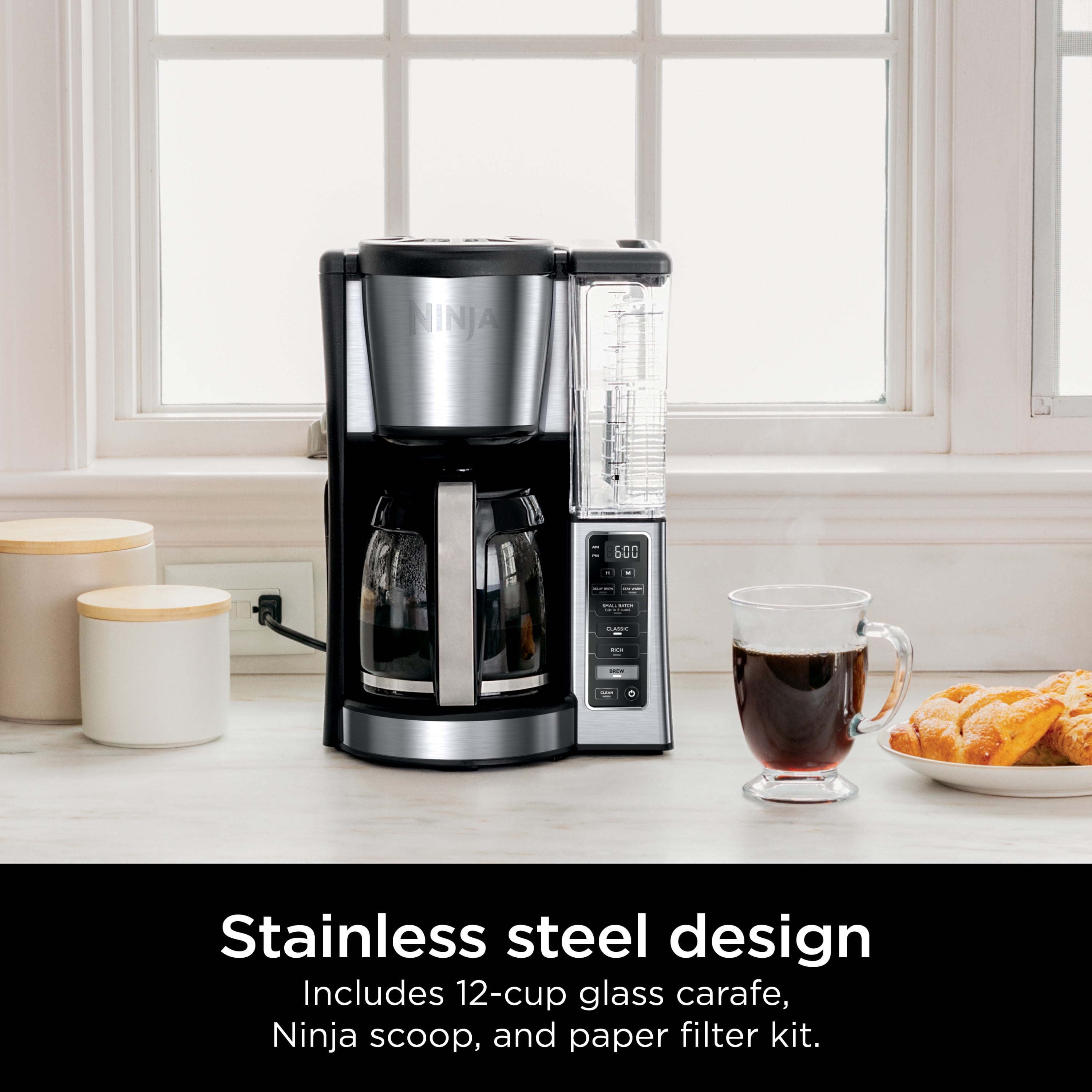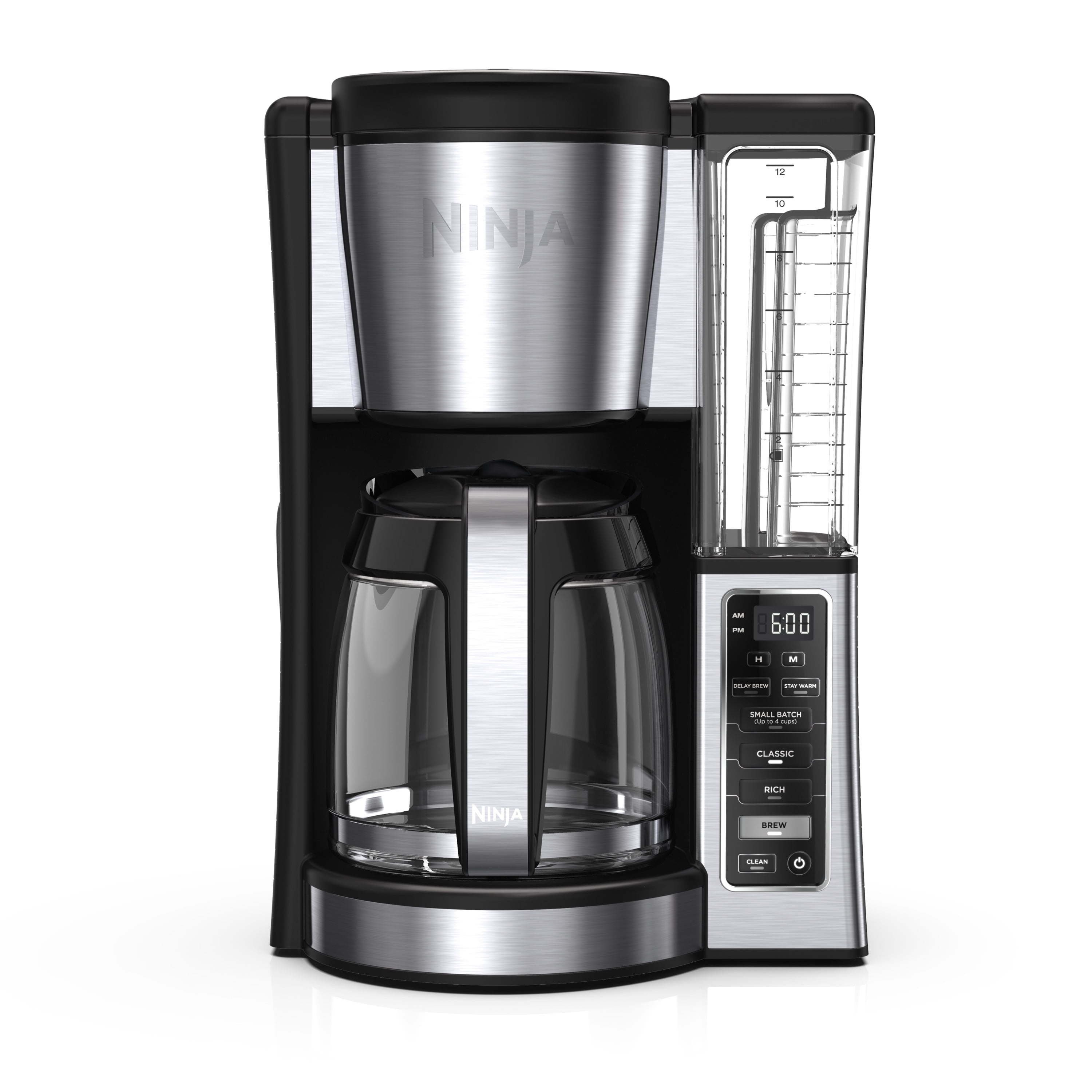 2 Brew Styles: Classic or Rich, each brew is flavorful and never bitter with custom brew strengths. Hotter Brewing Technology: Delivers even saturation and temperature control for ultra-flavorful coffee. Wake up to Hot Coffee: 24-hour programmable delay brew allows you to prepare your brew up to a day in advance. Adjustable Warming Plate: Keep coffee fresh and flavorful up to 4 hours. Removable Water Reservoir: Conveniently carry the 60-oz. water reservoir to your sink for easy filling. Mid-Brew Pause: Pour yourself a cup before the brew is complete. Small Batch Function: Ensure your coffee is never diluted when brewing a small batch (14 cups). Includes: 12-cup glass carafe, paper filter kit, scoop.
