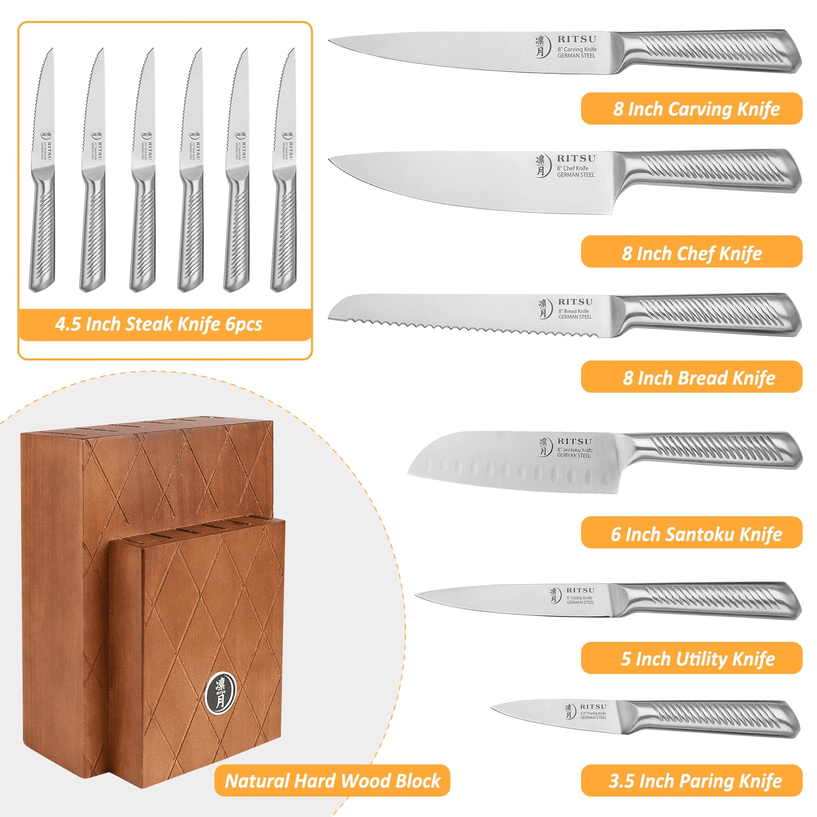 1.RITSU 13 pieces kitchen knife set includes 8" Chef Knife, 8" Bread Knife 8" Carving Knife, 6" Santoku Knife, 5" Utility Knife, 3.5" Inch Paring Knife, 6pcs 4.5" Inch Steak Knives, and a durable Wooden Block.