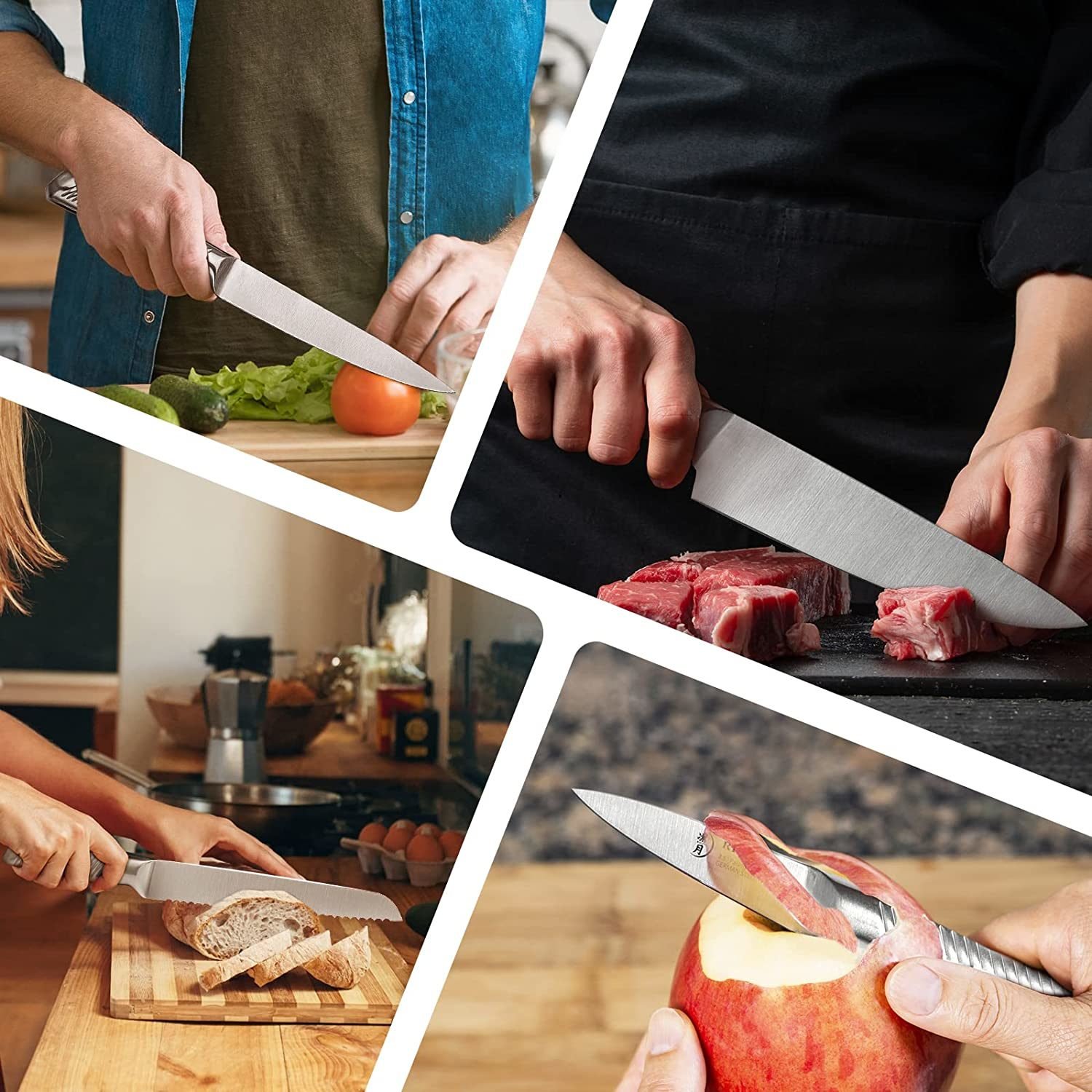 3.This Kitchen knife set can be used for your daily kitchen tasks of chopping, slicing, dicing, and mincing all kinds of meat, vegetables, fruits, bread, and paring. Durable German steel blades effectively hold a sharp cutting edge for safe and efficient use.