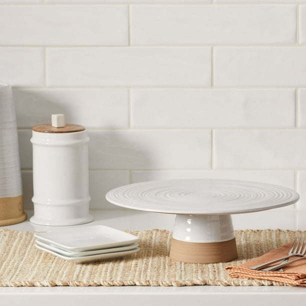Add modern elegance and a bit of rustic charm to your dessert game with the Better Homes & Gardens Abbott Exposed Clay Stoneware Pedestal Cake Stand, White Speckled. This round, durable, stoneware cake stand features an artisanal style, with a textured groove pattern. Delicate speckles on a glazed, white finish contrast the exposed, matte clay bottom. The pedestal cake stand makes a great dessert showcase with its contemporary design and neutral tones that complement most home décor styles, dinnerware, and cutlery pieces. This sturdy, stoneware cake stand weighs 3.53 pounds. For best results, hand wash only. Perfect for showcasing cakes, cupcakes, pies, tarts, and more, the Better Homes & Gardens Abbott Exposed Clay Stoneware Pedestal Cake Stand makes a great addition to any kitchen.