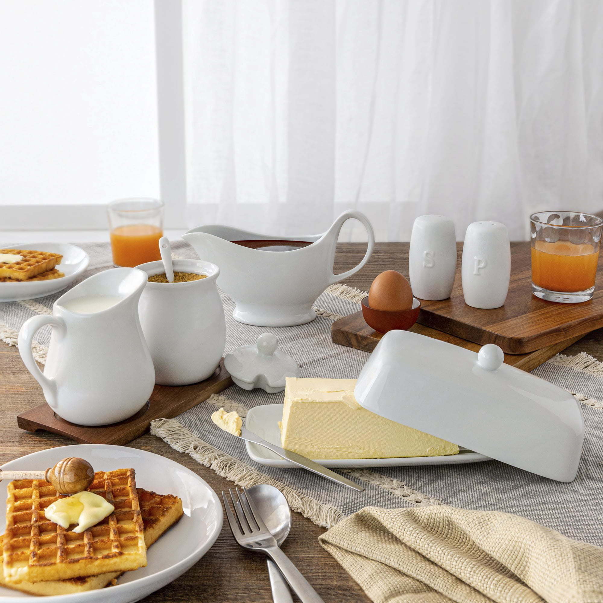 This a set with a cream & sugar set with an acacia wood base, an embossed porcelain salt and pepper shaker set, a porcelain gravy boat and a porcelain butter dish. These items are all made from high quality porcelain so they are dishwasher, microwave and oven safe. Pair these with many other serve pieces and dinnerware from Better Homes & Gardens. Items come in a re-shipper box for safety and do not ship in a gift box.