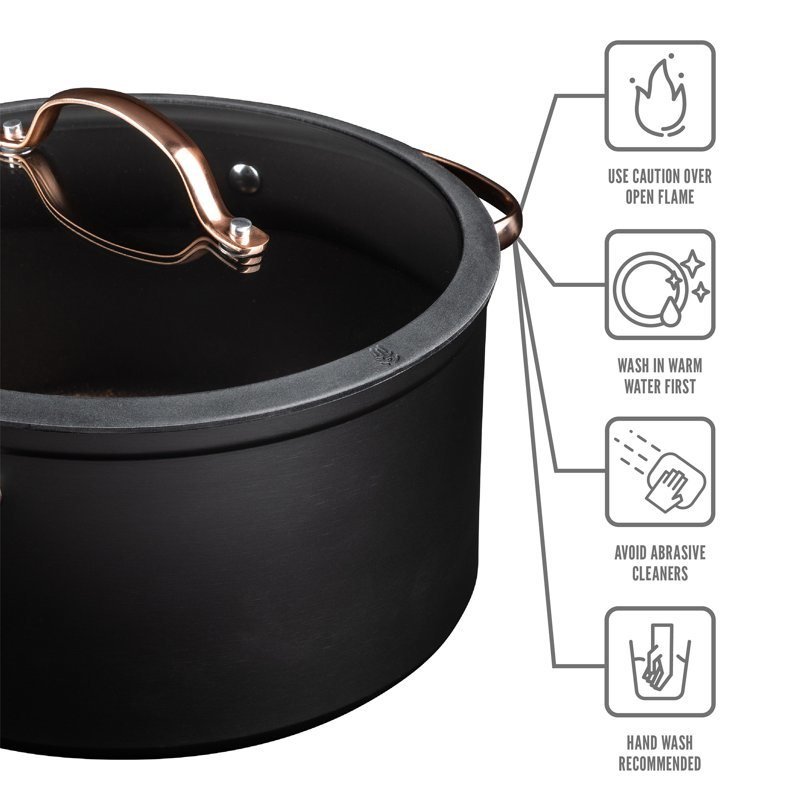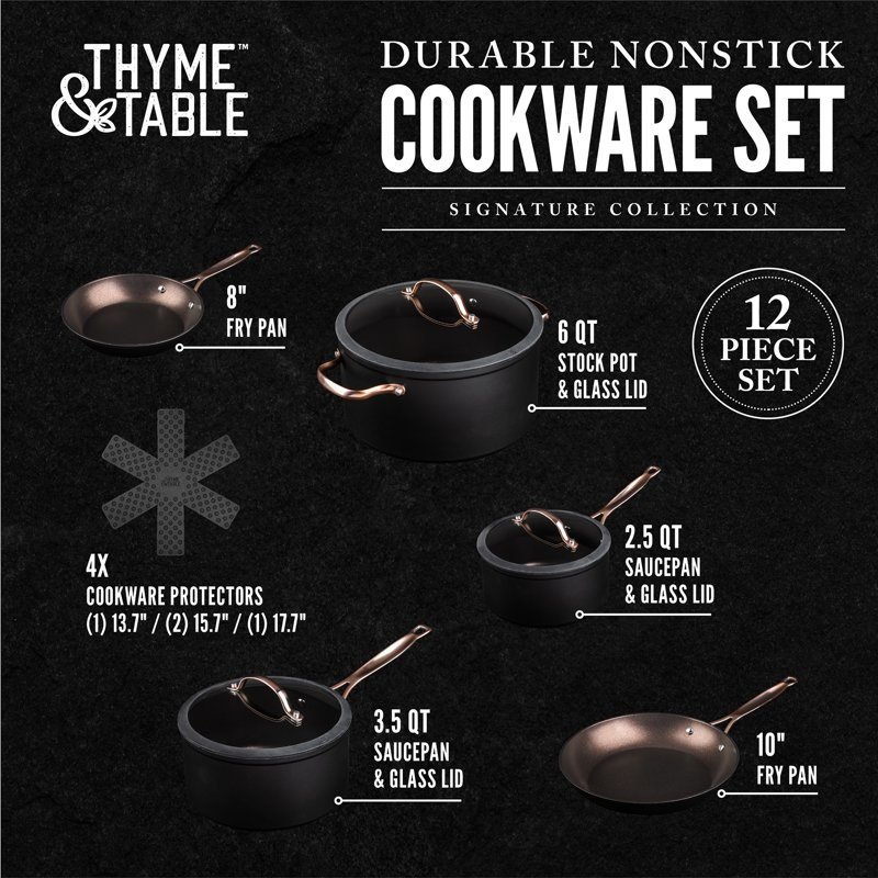 Nonstick 12-Piece Cookware Set, Gold is where culinary artistry meets effortless functionality. Elevate your cooking experience with this exquisite collection, meticulously crafted to meet the demands of both amateur enthusiasts and seasoned chefs. Indulge in the luxury of a flawlessly nonstick surface, expertly engineered to ensure your creations effortlessly slide off the pan. Whether it's sautéing delicate vegetables or searing succulent meats, our cookware guarantees an exceptional cooking performance every time. Each piece in this set is thoughtfully designed with versatility in mind. From the compact saucepans perfect for simmering delicate sauces, to the spacious stockpot ideal for crafting savory stews, our cookware collection empowers you to conquer any culinary endeavor. Crafted with durability at its core, this cookware set is built to withstand the test of time. The heavy-gauge aluminum construction ensures even heat distribution, eliminating hotspots that could compromise your masterpiece. For product's longevity, please hand wash in warm water with a soft sponge.Non-Stick 12-Piece Cookware Set, GoldTriple layer, NonstickGreat for all cooktopsMade without PFOA or PFOSDesigned for fast cooking