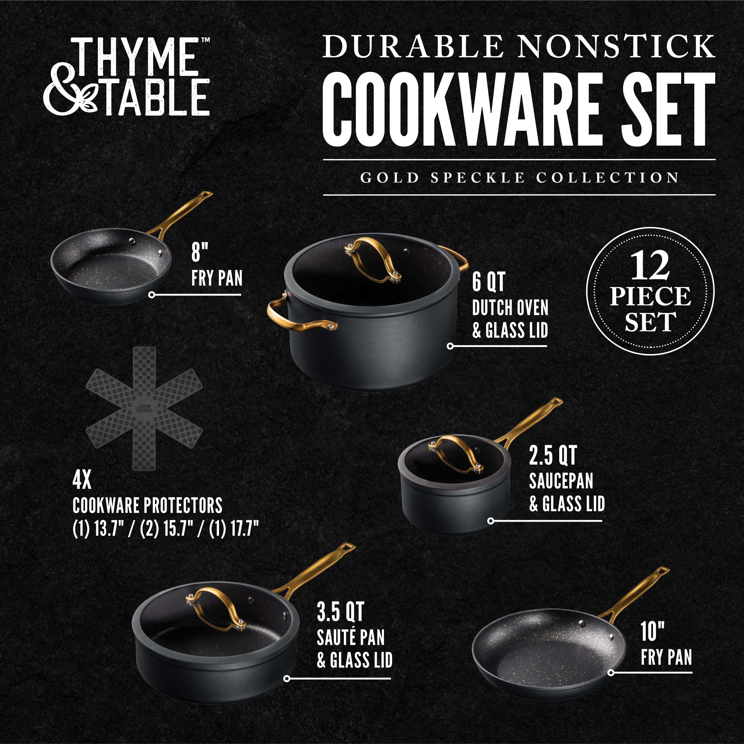 Nonstick 12-Piece Cookware Set, Gold is where culinary artistry meets effortless functionality. Elevate your cooking experience with this exquisite collection, meticulously crafted to meet the demands of both amateur enthusiasts and seasoned chefs. Indulge in the luxury of a flawlessly nonstick surface, expertly engineered to ensure your creations effortlessly slide off the pan. Whether it's sautéing delicate vegetables or searing succulent meats, our cookware guarantees an exceptional cooking performance every time. Each piece in this set is thoughtfully designed with versatility in mind. From the compact saucepans perfect for simmering delicate sauces, to the spacious stockpot ideal for crafting savory stews, our cookware collection empowers you to conquer any culinary endeavor. Crafted with durability at its core, this cookware set is built to withstand the test of time. The heavy-gauge aluminum construction ensures even heat distribution, eliminating hotspots that could compromise your masterpiece. For product's longevity, please hand wash in warm water with a soft sponge.Non-Stick 12-Piece Cookware Set, GoldTriple layer, NonstickGreat for all cooktopsMade without PFOA or PFOSDesigned for fast cooking