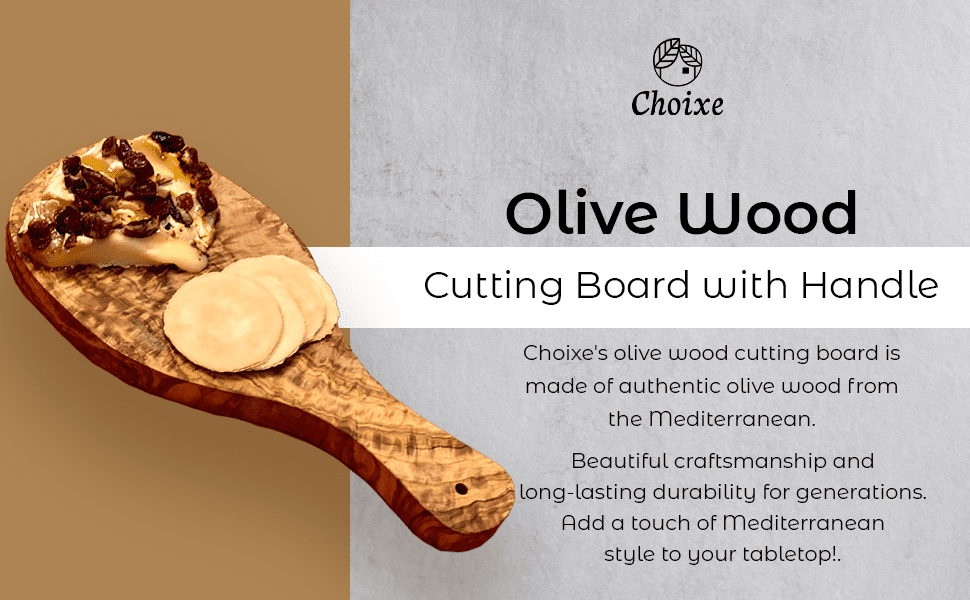 This exceptional piece of craftsmanship will become your favorite accessory in your kitchen for every occasion. Choixe's olive wood cutting board is made of authentic olive wood from the Mediterranean. The stunning natural patterning of olive wood and unique craftsmanship make a stunning multi-functional cutting board unique to any tabletop.Beautiful craftsmanship and long-lasting durability for generations. Add a touch of Mediterranean style to your tabletop!CRAFTSMANSHIP. Our highly skilled artisans hand-pick each piece of wood and carefully carve it into these perfectly polished; eye-catching; and functional cutting boards.MULTI-FUNCTIONAL. This piece can serve as a cutting board; cheese/fruit/cold meats serving board; or just as an accessory to decorate your tabletop with a touch of Mediterranean style!HIGH-QUALITY. Stylish; functional; and timeless home accessory with a fine regard for detail.Each piece crafted of this extremely hard and durable wood is shaped and sanded; then polished with olive oil to moisturize the surface and bring out the beautiful color and grain pattern.UNIQUENESS. Due to this product's natural material and handcrafted nature; no pieces are identical. Natural variations in wood's color and grain pattern make each piece unique.SUSTAINABLE. Our olive wood products are crafted in a family-owned woodshop using only sustainably sourced wood from olive trees that no longer bear fruit.Directions: Hand-wash and dry thoroughly. Do not soak. Periodically oil with food-safe mineral oil.Dimensions: 11.3in x 5.3in x 0.8inWeight: 1 lbs.