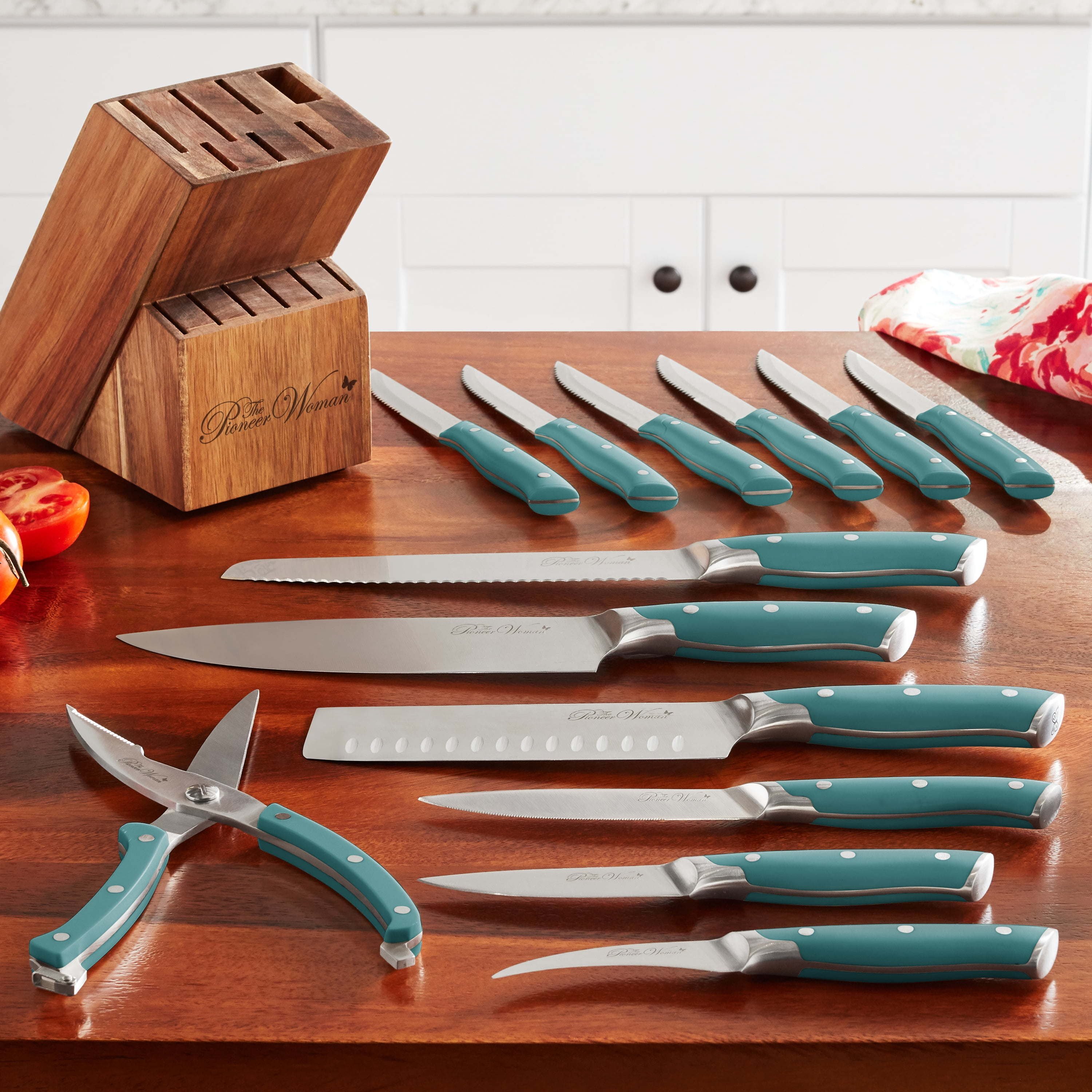 Slice and dice ingredients in style. Every country cook needs a dependable knife they can rely on to chop their way to a delicious dinner, but with this set, you'll get a total of 14 dependable knives to help you make your best meals yet. With a variety of fundamental kitchen knives ready for you to use, you'll be able to handle just about any ingredient that comes your way. Their precision-ground edges stay sharper for longer, and their forged design provides stability and control while cutting. Plus, the decorative look of the knives' handles and the acacia wood storage block add a touch of elegance to any countertop.